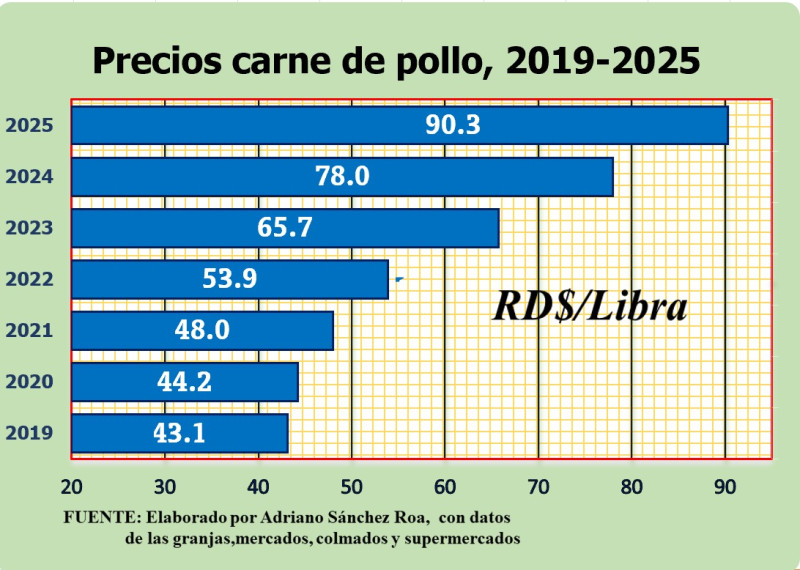 El reciente aumento de la carne de pollo, que oscila entre 85,90 y 100 pesos la venta por libra en los colmados y ventas de distribución de uno de los principales alimentos de consumo masivo del plato dominicano.