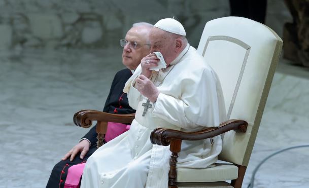 El papa se levanta y se puede sentar, mientras sigue el tratamiento para la neumonía bilateral